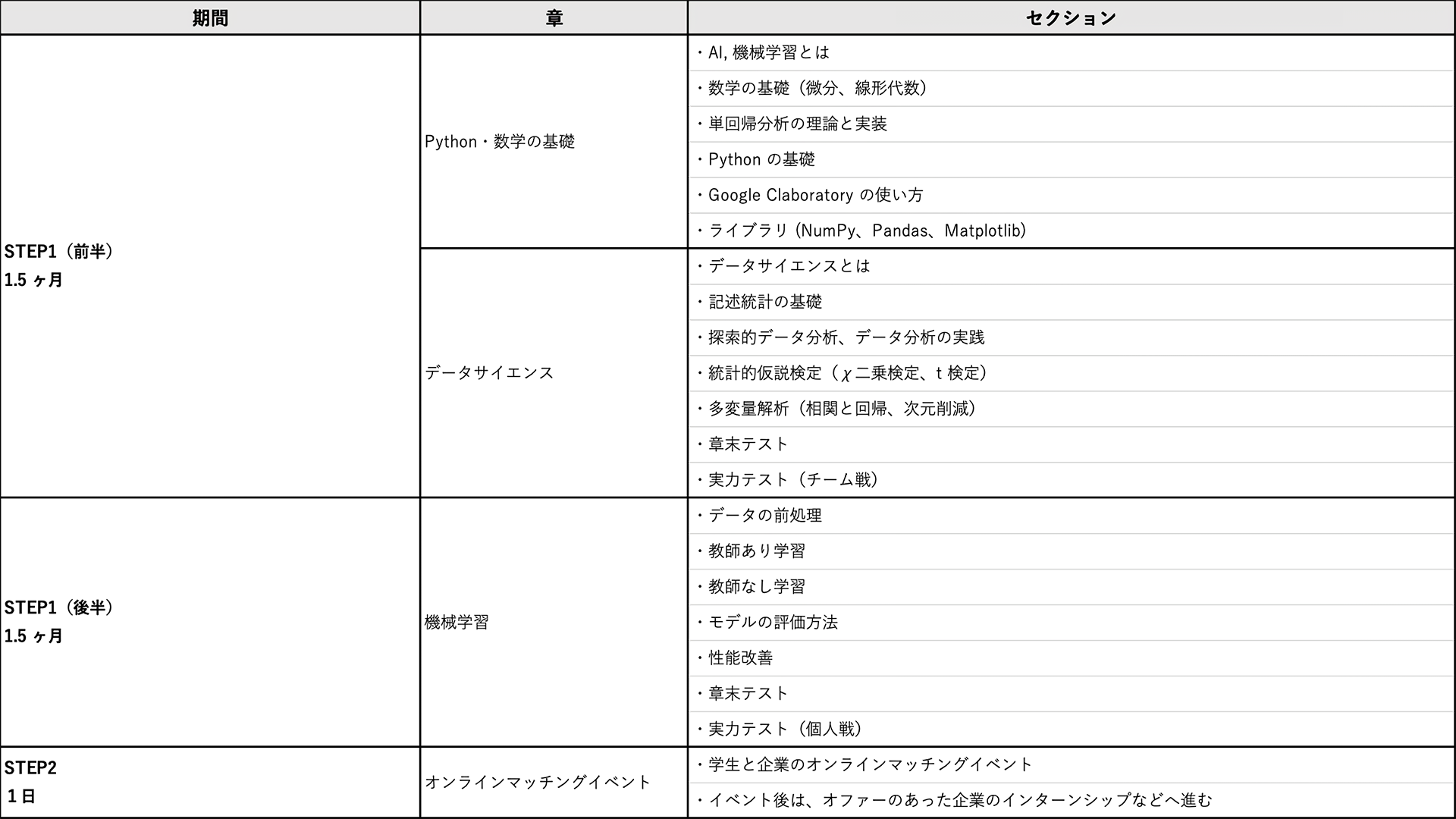 STEP1:約 3 カ月間、オンラインにてデータサイエンス・機械学習・AI・ディープラーニングについて学習。