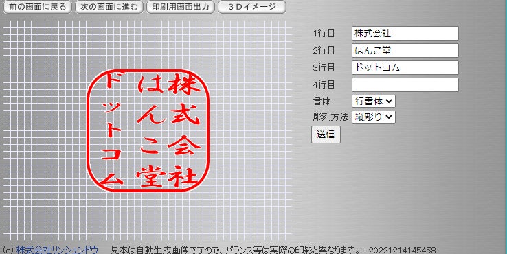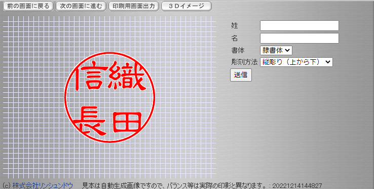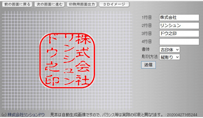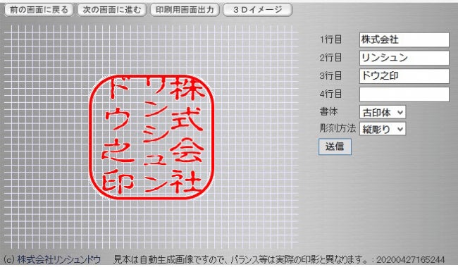 文字列を入力し「送信」ボタンをクリックすると、印影イメージが表示されます。