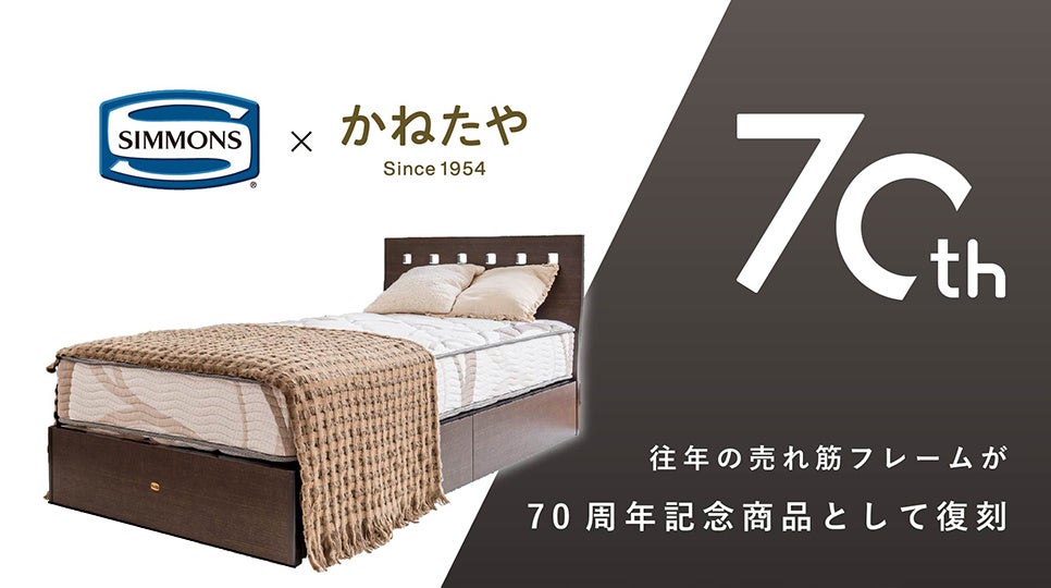 記念すべきアニバーサリー企画として、シモンズ株式会社(東京都港区/代表取締役:伊藤正文)が、かねたやオリジナルベッドを開発いたしました。フレームは、惜しくも廃番となった売れ筋フレームのS-Lineを復刻し、トレンドカラーのグレージュ、ダークの新たなカラーバリエーションの2色構成で登場。さらに引き出し付、ステーションタイプ、ダブルクッションの3タイプから選択可能です。