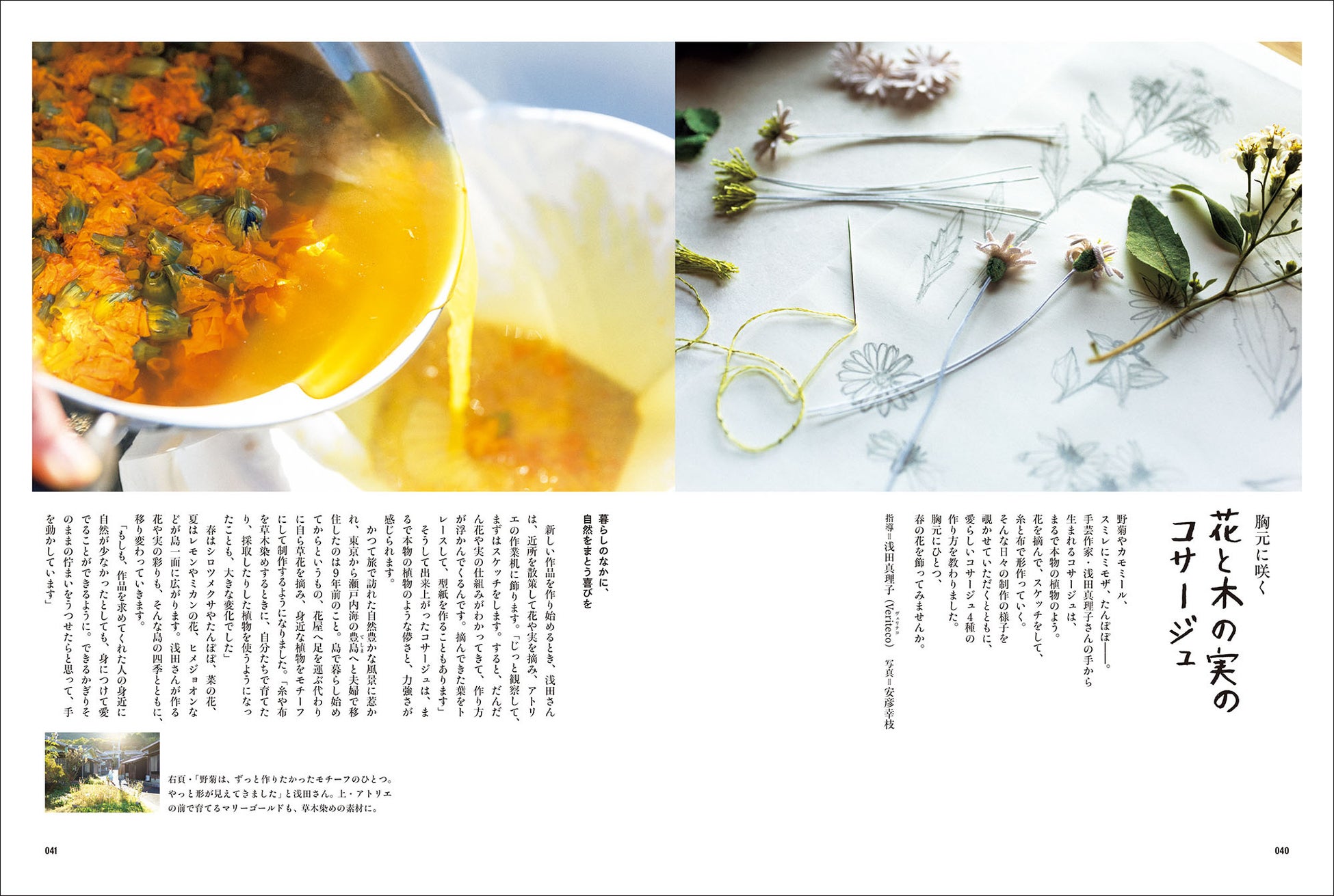 また手芸記事として、本物とみまごうような「花と木の実のコサージュ」の作り方も掲載しています。