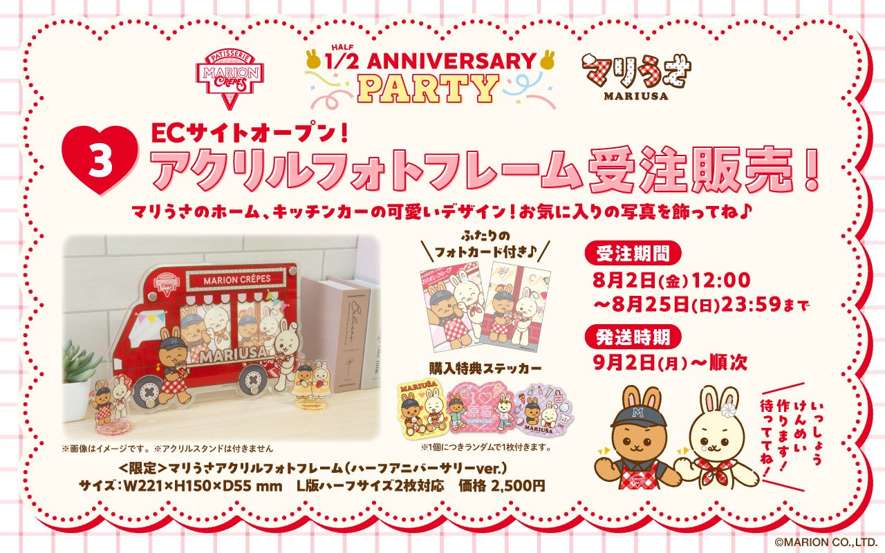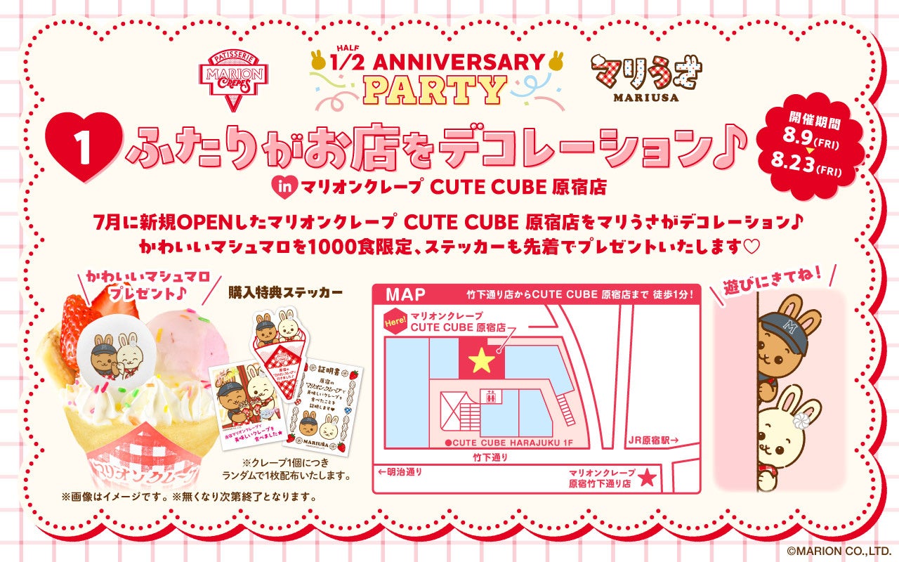 8月9日(金)よりマリオンクレープの原宿竹下通り2号店、CUTE CUBE 原宿店がマリうさ仕様に大変身。また、8月2日(金)には限定フォトフレームを販売するオンラインショップをオープン。同日にマリうさのLINEスタンプを発売するなど、ハーフアニバーサリーを盛り上げるキャンペーンをご用意しております。