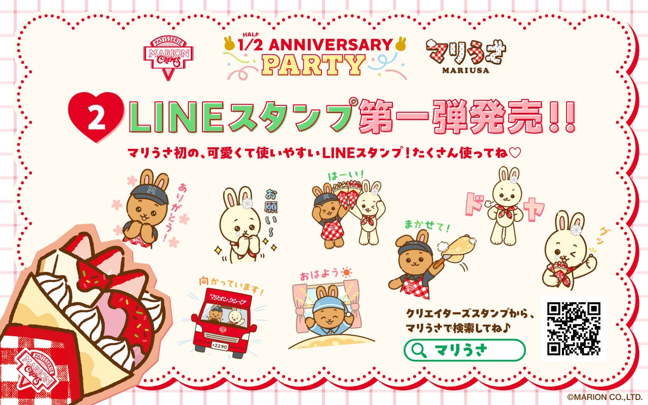 日本初の紙巻きクレープ専門店株式会社マリオン(本社:東京都渋谷区、代表取締役社長:平田照)から、今年2月2日の「クレープの日」に誕生した公式キャラクターの「マリうさ」。8月2日(金)にむかえるハーフアニバーサリーを記念し、アニバーサリーイベントを開催いたします。