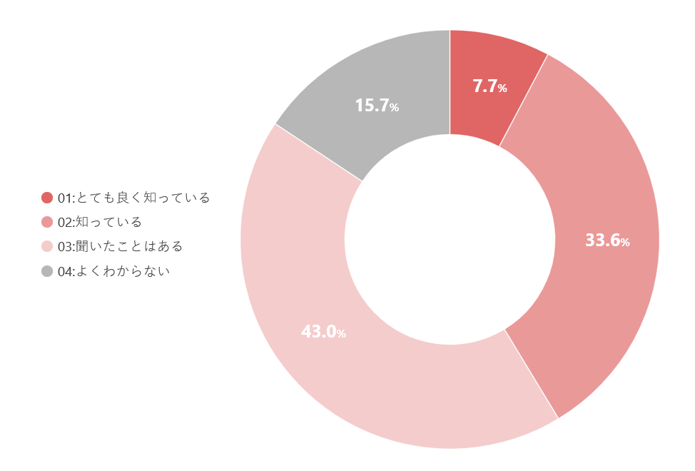 SDGsについて、もっとも多い回答は『聞いたことはある』で43.0%、『知っている』が33.6%『とてもよく知っている』が7.7%となっており、SDGsについて認識している人は84.3%にのぼることがわかりました。