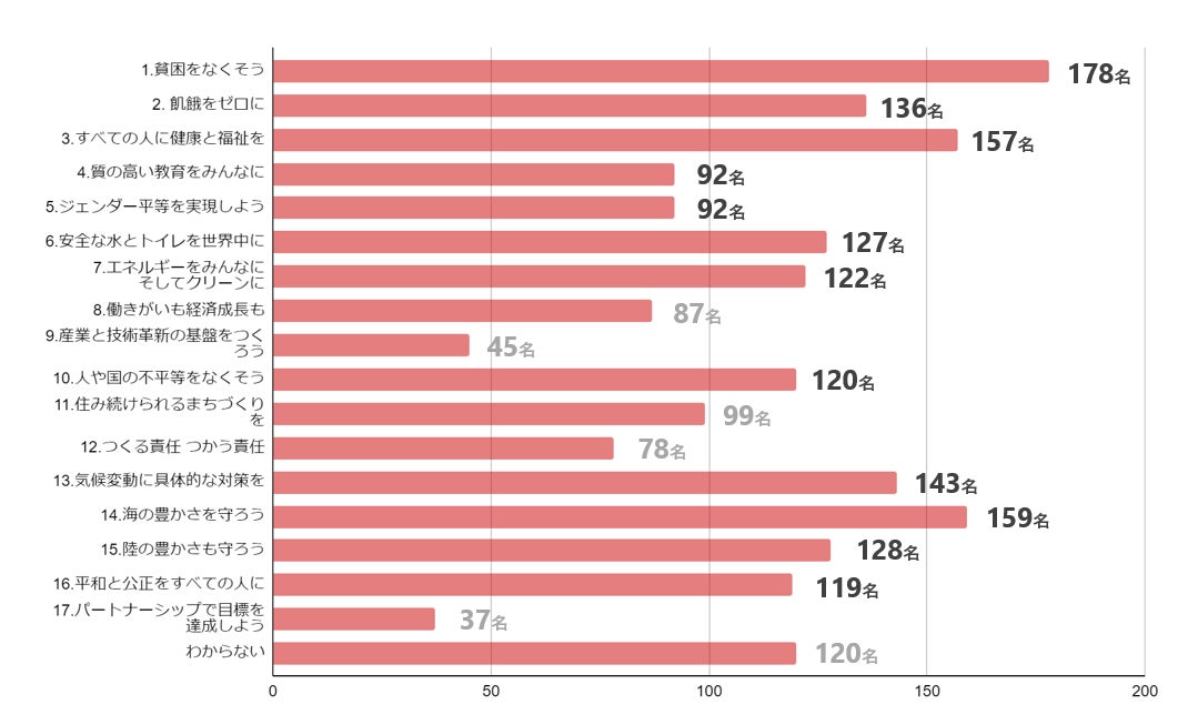また、興味がある/興味が持てる項目については、『1.貧困をなくそう』『3.すべての人に健康や福祉を』などの人権問題や、『6.安全な水とトイレを世界中に』『14.海の豊かさを守ろう』などの環境問題に関する項目に回答が集まっています。