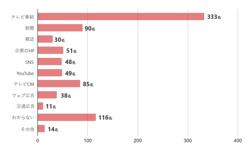 SDGsを認知したり、興味を持ったりするきっかけとして『テレビ番組』が333名と圧倒的な回答数となりました。『テレビCM』と回答した85名を合わせると、テレビはSDGsの認知度向上に大きな役割を果たしていることが伺えます。