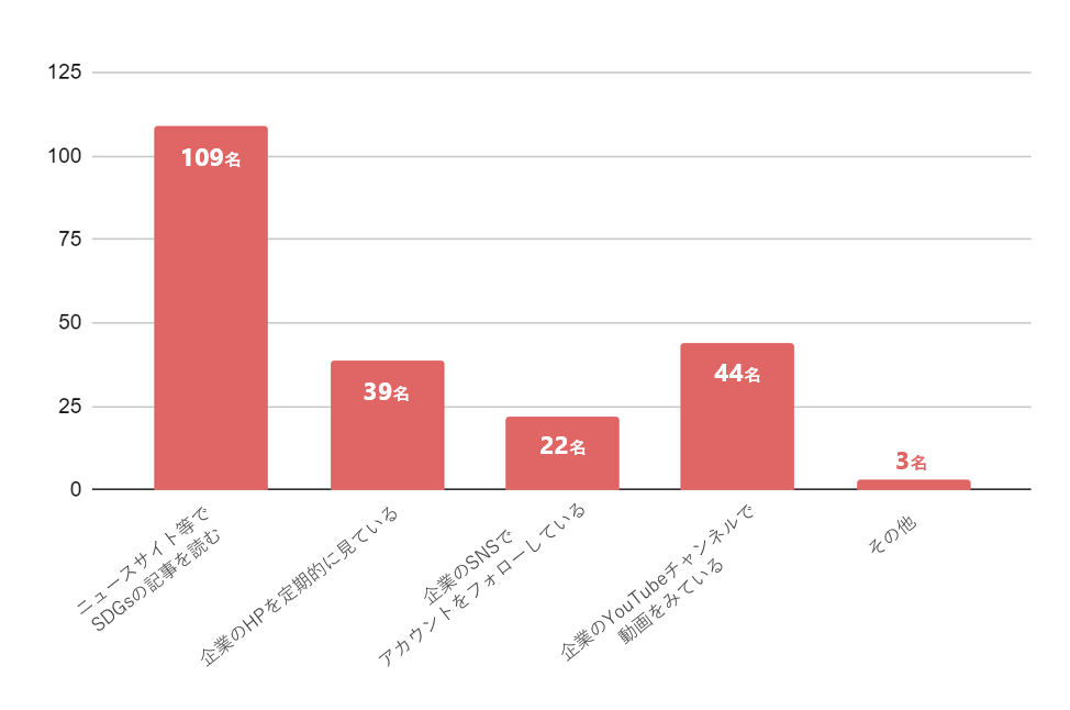 また、『情報収集している』と回答した人においても、『ニュースサイト等でSDGsの記事を読む』が109名と多い中、企業のホームページやSNS、YouTubeチャンネルを見て情報収集している人は多くないことから自らSDGsに関する情報を取りに行くことは少ないようです。