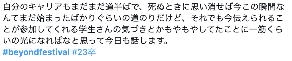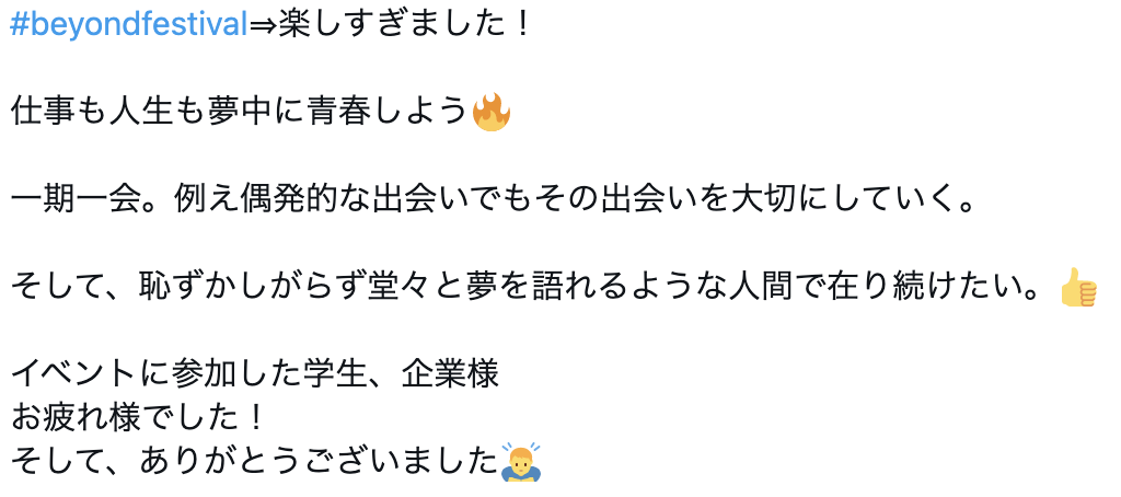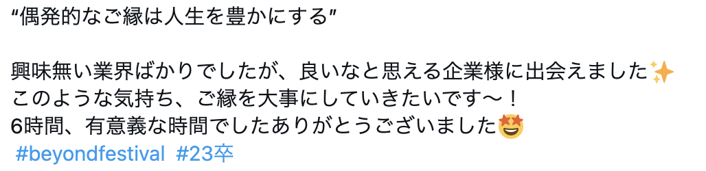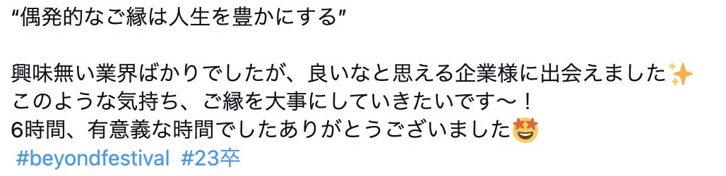 Twitterでは、「#beyondfestival」をつけて参加企業や学生が当日学んだことを発信しています。1回の開催につき、投稿数は約400件に上ります。学生はSNS上で就活仲間と繋がることができ、企業は自社の採用ブランディング強化に繋げることもできます。