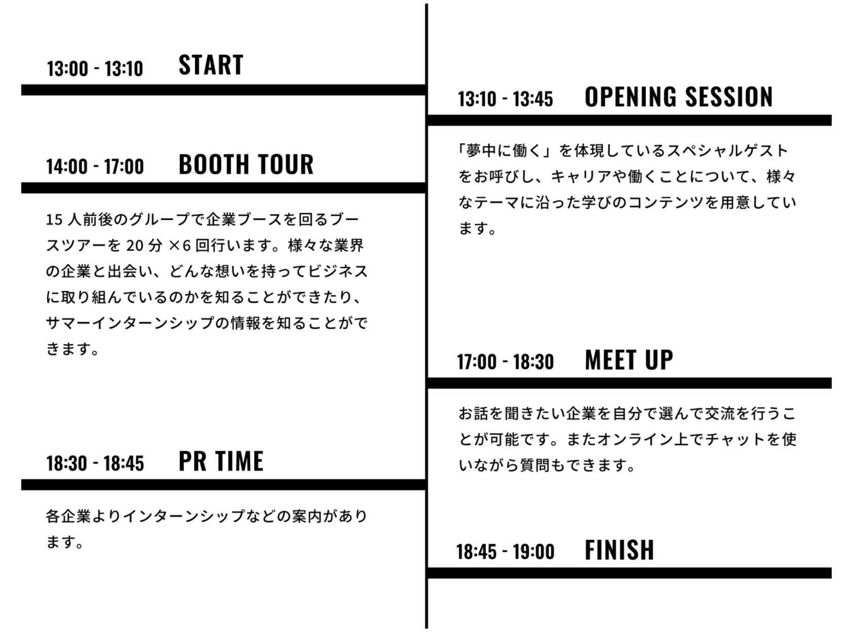 日本全国から集まる200名の学生と最大15社の企業に出会うことができます。オンライン就活が主流になりつつある今、学生や企業同士の横の繋がりや企業と学生の濃密なコミュニケーションが取りづらくなっています。「意欲的な志を持つ学生と企業」が一同に会すことで、学生と企業の出会いはもちろんのこと、学生同士、企業同士で新たな繋りが生まれます。