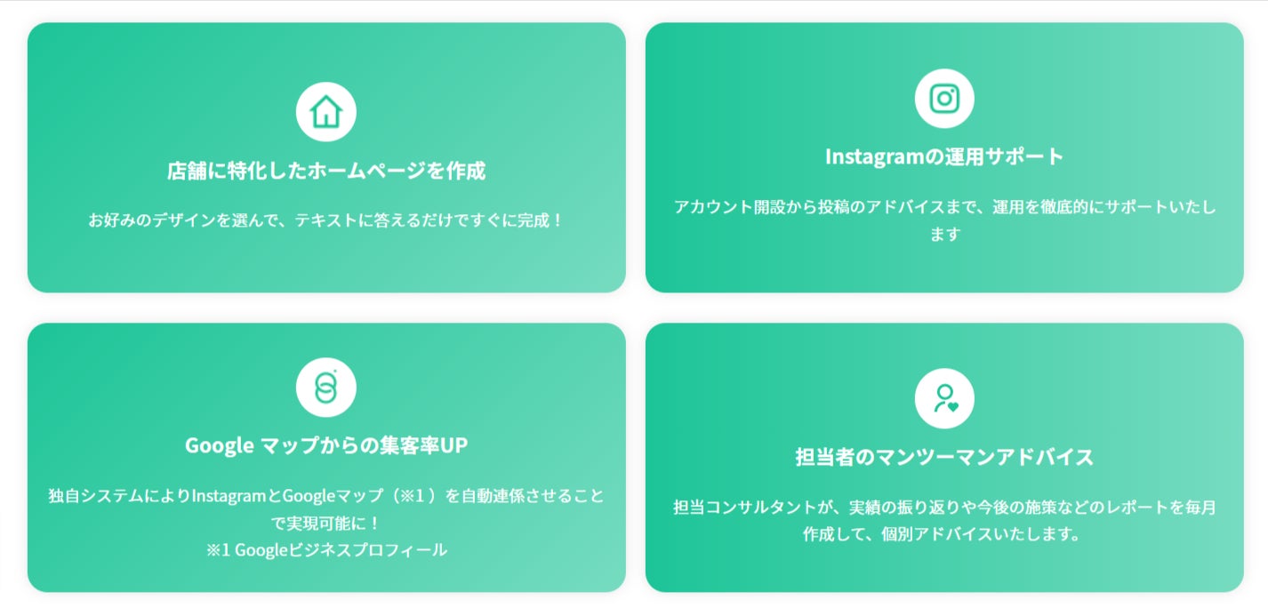 本サービスは、店舗集客に特化したホームページ制作、インスタグラムの運用サポートから担当者からのワンツーマンアドバイスまで、担当者が店舗集客をサポートします。