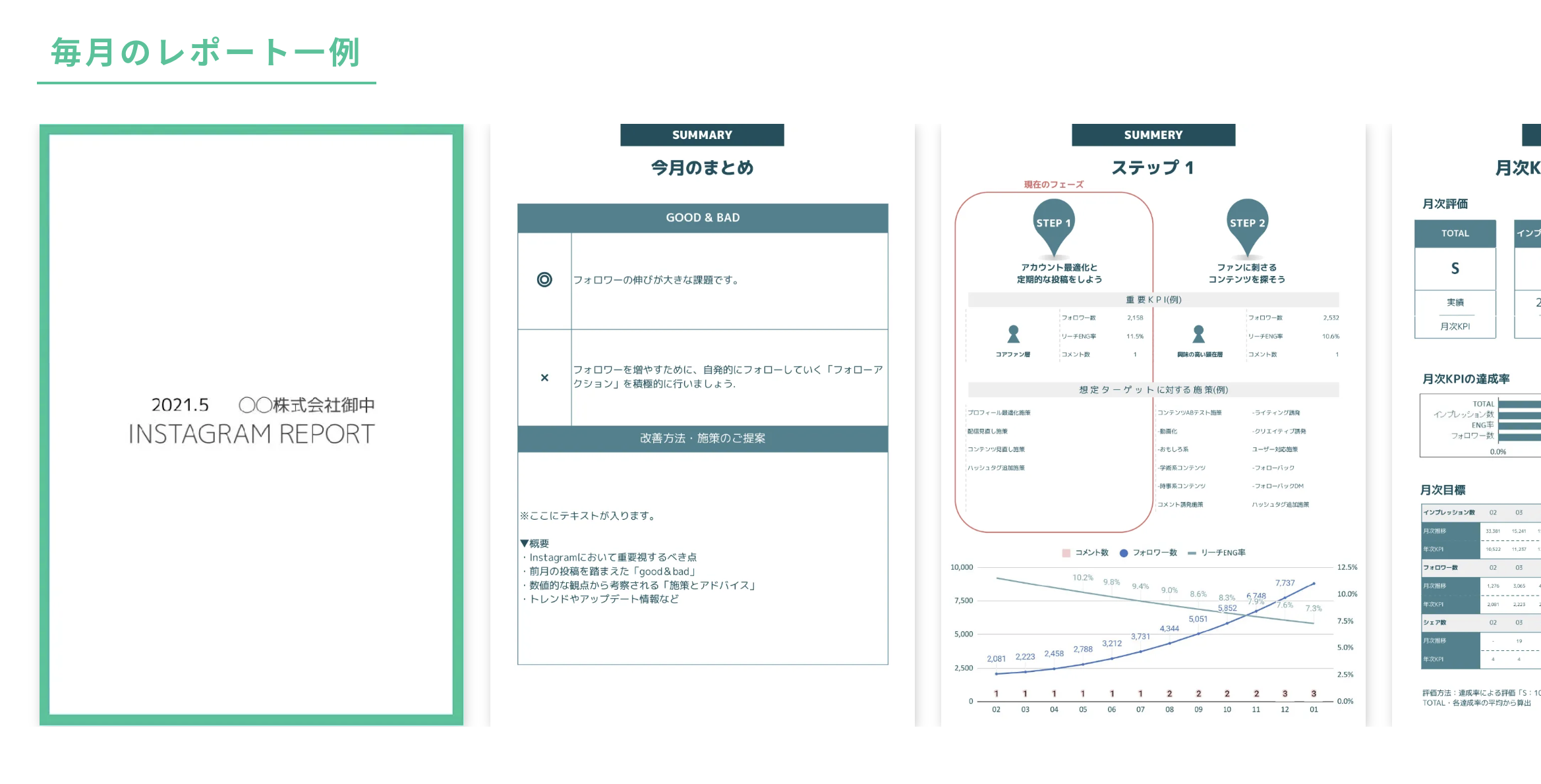 また、毎月インスタグラムの運用実績レポートを作成します。