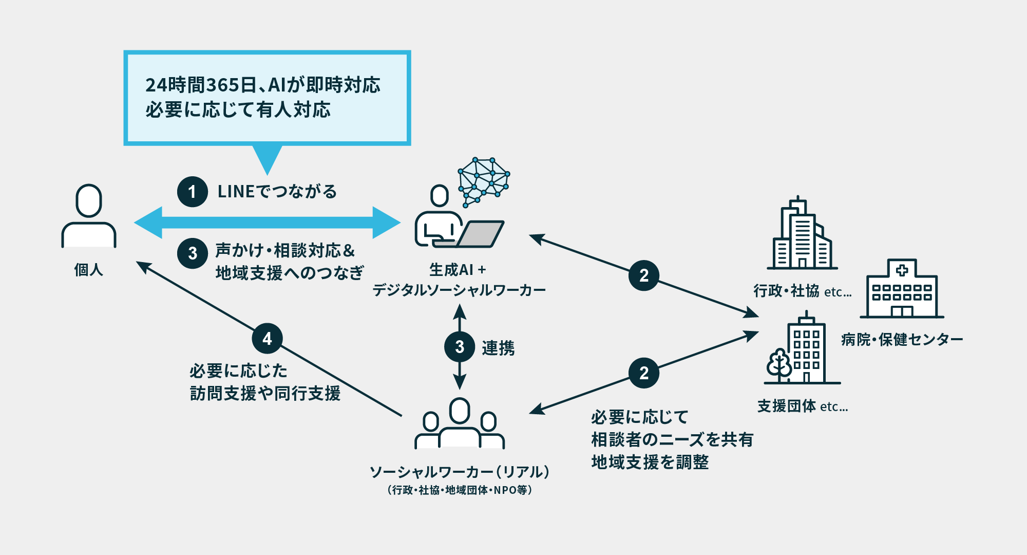 SNSを活用した相談支援に生成AI技術を組み合わせることで、24時間365日の即時対応が可能になります。