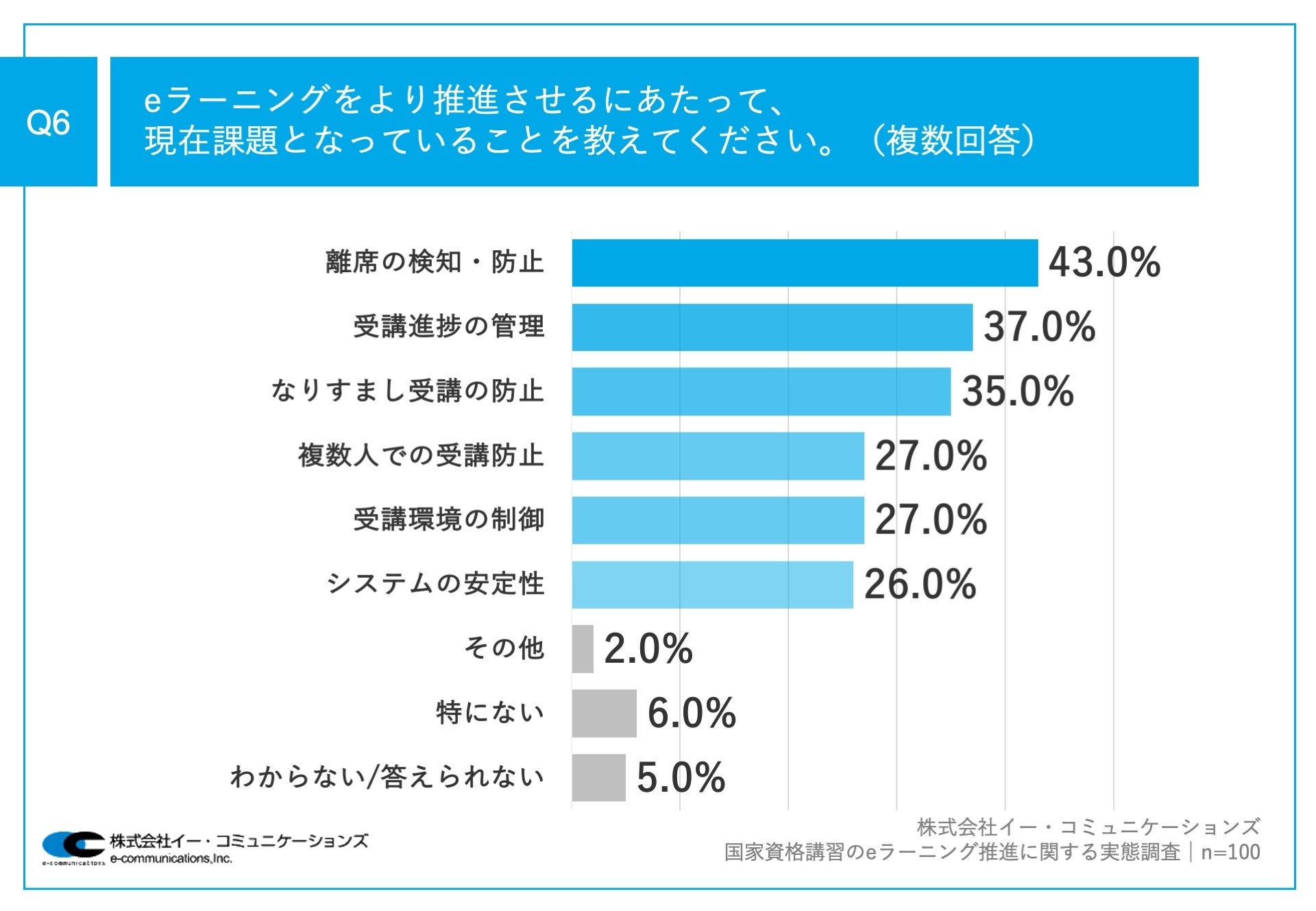 「Q6.eラーニング推進において、現在課題となっていることを教えてください。(複数回答)」(n=100)と質問したところ、「離席の検知・防止」が43.0%、「受講進捗の管理」が37.0%、「なりすまし受講の防止」が35.0%という回答となりました。