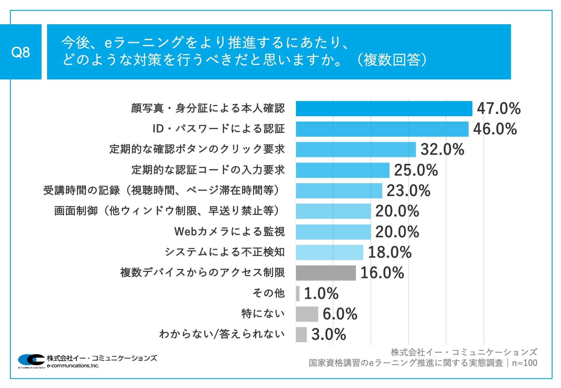 「Q8.eラーニングをより推進するにあたり、どのような対策を行うべきだと思いますか。(複数回答)」(n=100)と質問したところ、「顔写真・身分証による本人確認」が47.0%、「ID・パスワードによる認証」が46.0%、「定期的な確認ボタンのクリック要求」が32.0%という回答となりました。