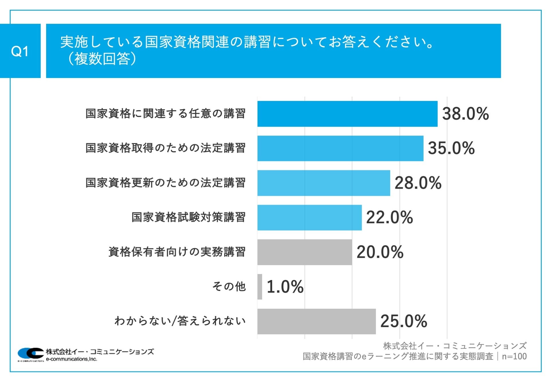 「Q1.実施している国家資格関連の講習についてお答えください。(複数回答)」(n=100)と質問したところ、「国家資格に関連する任意の講習」が38.0%、「国家資格取得のための法定講習」が35.0%、「国家資格更新のための法定講習」が28.0%という回答となりました。