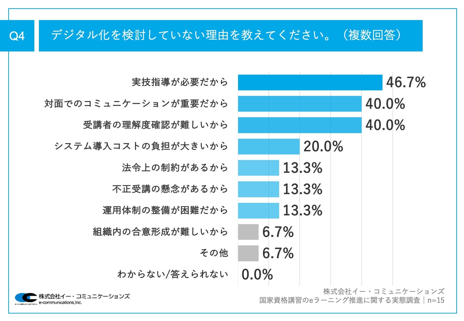 Q3で「デジタル化は検討していない」と回答した方に、「Q4.デジタル化を検討していない理由を教えてください。(複数回答)」(n=15)と質問したところ、「実技指導が必要だから」が46.7%、「対面でのコミュニケーションが重要だから」が40.0%、「受講者の理解度確認が難しいから」が40.0%という回答となりました。