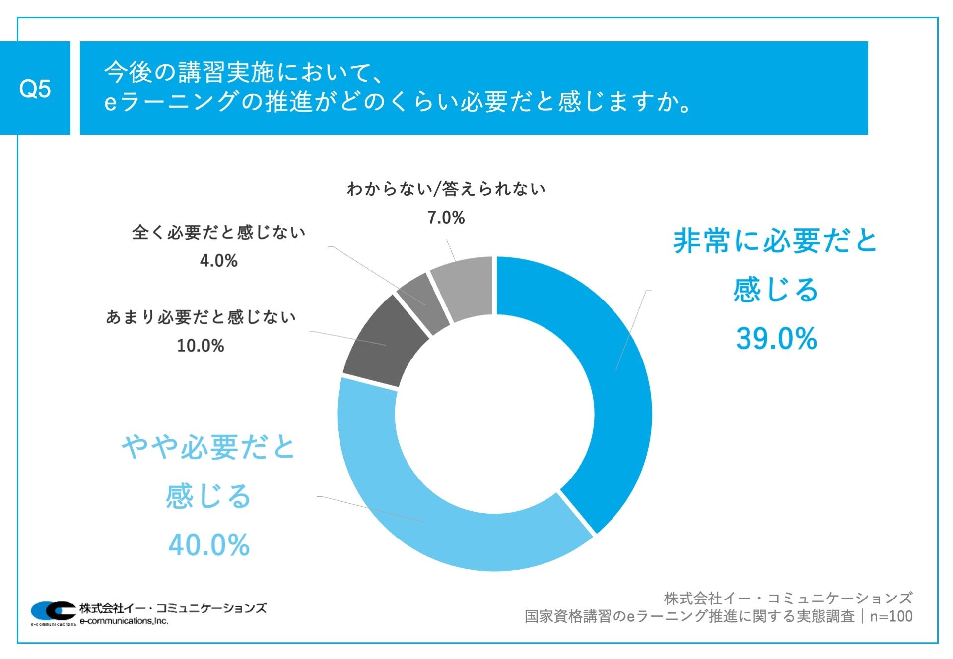 「Q5.今後の講習実施において、eラーニングの推進がどのくらい必要だと感じますか。」(n=100)と質問したところ、「非常に必要だと感じる」が39.0%、「やや必要だと感じる」が40.0%という回答となりました。