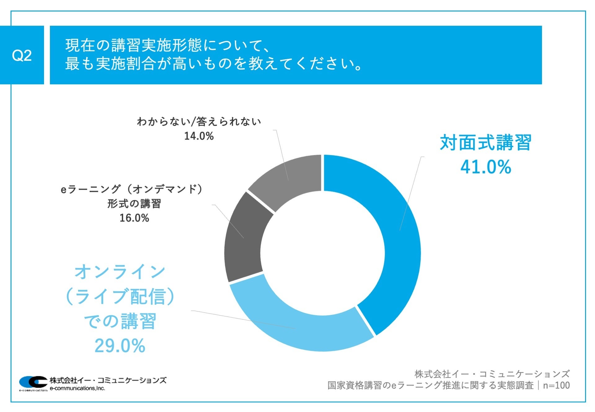 「Q2.現在の講習実施形態について、最も実施割合が高いものを教えてください。」(n=100)と質問したところ、「対面式講習」が41.0%、「オンライン(ライブ配信)での講習」が29.0%という回答となりました。