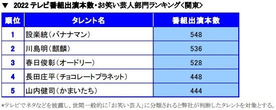 ▼2022テレビ番組出演本数・お笑い芸人部門ランキング<関東>