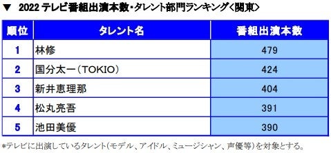 ▼2022テレビ番組出演本数・タレント部門ランキング<関東>