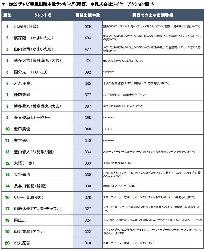 ▼2022テレビ番組出演本数ランキング<関西> *株式会社ワイヤーアクション調べ
