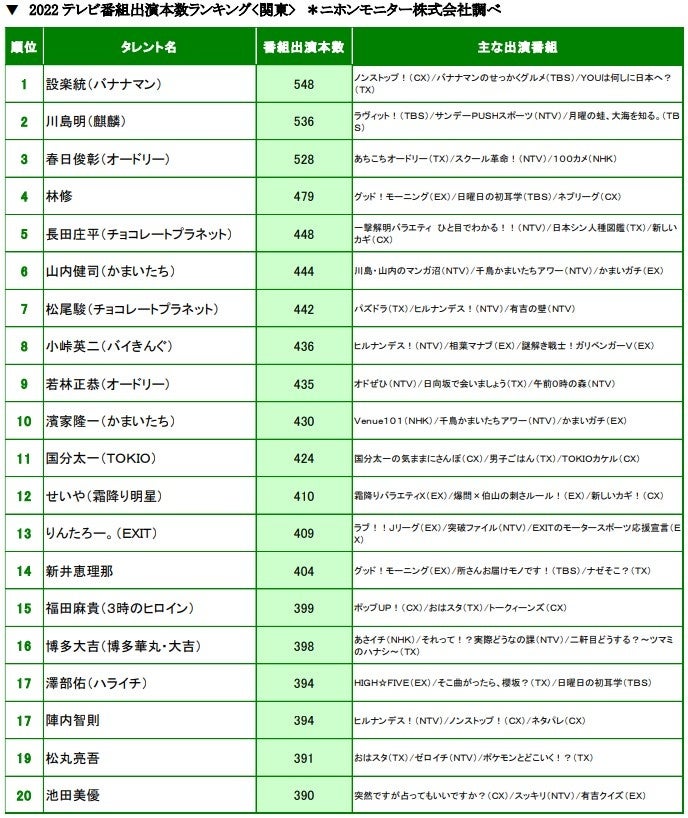 ▼2022テレビ番組出演本数ランキング<関東> *ニホンモニター株式会社調べ