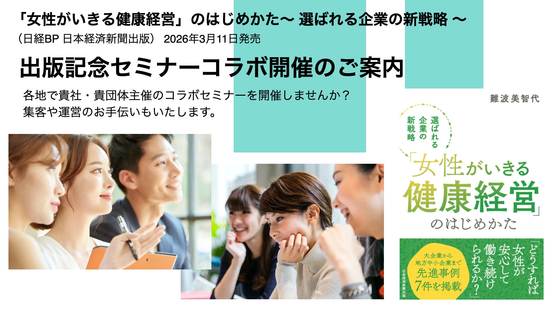 『「女性がいきる健康経営」のはじめかた 〜 選ばれる企業の新戦略 〜』の出版を記念して、2026年4月1日より、全国各地の経済団体、地方自治体、企業等の主催するセミナーに、著者難波が登壇、健康経営の理解を起点に、戦略策定、企画、実行伴走を通じて、推進にコミットします。