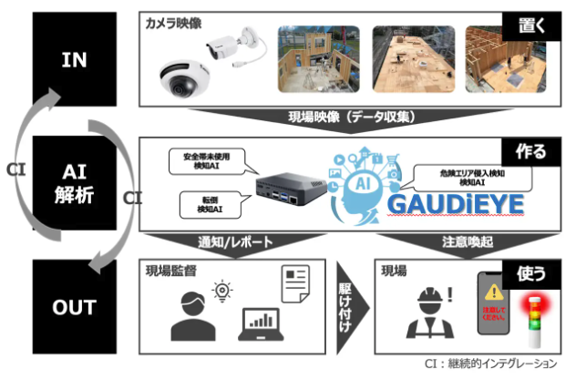 2022年4月に正式販売を開始したGAUDiEYEは、独自AIが簡単に搭載でき、高精度のAI・メンテナンス性の高いIoT管理システム(GAUDi HUB)がありながら、AIカメラを低価格で提供するという製品が幅広い支持を集めています。製造・建設・介護など現場の安心・安全に貢献し、万が一の労災の予防・発生時の記録が残るAI機能搭載カメラです。