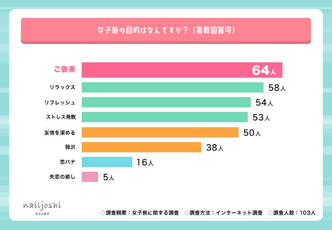 ・「女子旅の目的」1位は『ご褒美』(64人)、2位『リラックス』(58人)、3位『リフレッシュ』(54人)