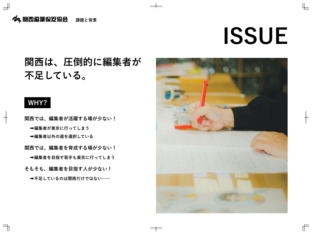 首都圏に集中するメディアの産業構造を疑い、関西というエリアにおいて編集人財の育成を図るとともに、編集業に従事する人・団体が安心して仕事ができるネットワークをつくることを目的としています。