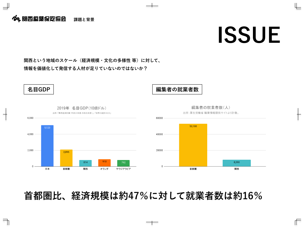 関西において編集者が活躍・育成できる場は不足しており、編集者を志す人がそもそも少なく、また志す人材も首都圏に流出しているのが現状です。編集人材の東京一極集中という課題に対して、関西はその解消の受け皿になりうるポテンシャルを有していると考えています。