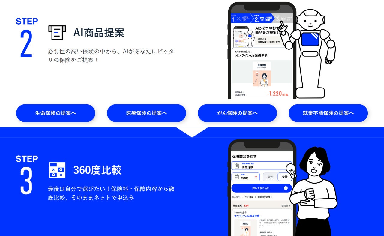 Step1でご回答頂いた内容に応じ、必要性の高い保険の中から、AIがお客さまにピッタリの保険をご提案します。