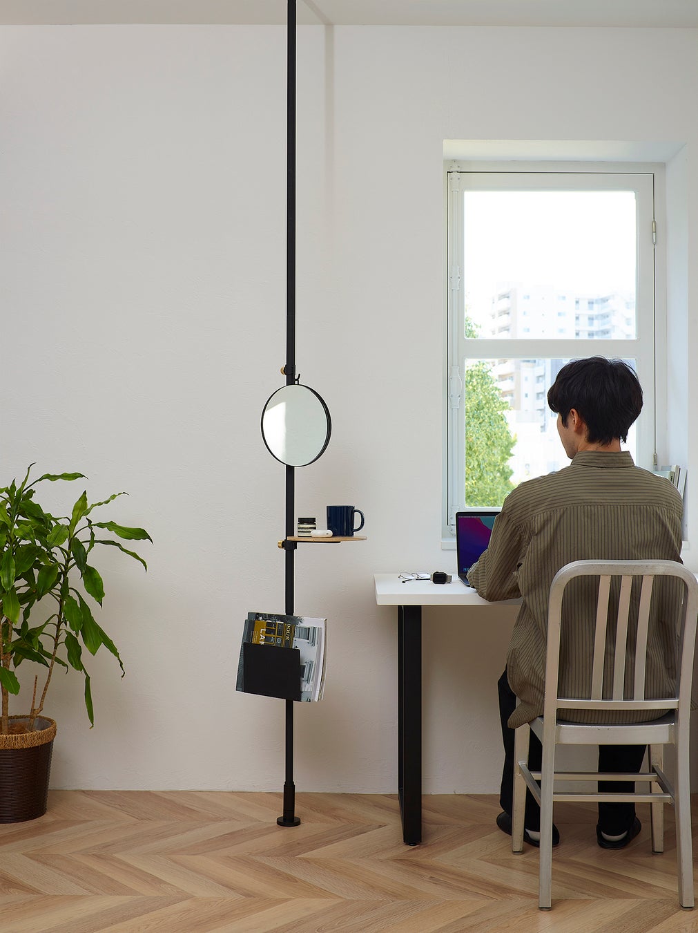 オンライン会議前に自分の身だしなみを整えて、シャキッとした気持ちで仕事に挑む。TableやBook Rackを組み合わせて収納を作れば、デスクを広く使えます。