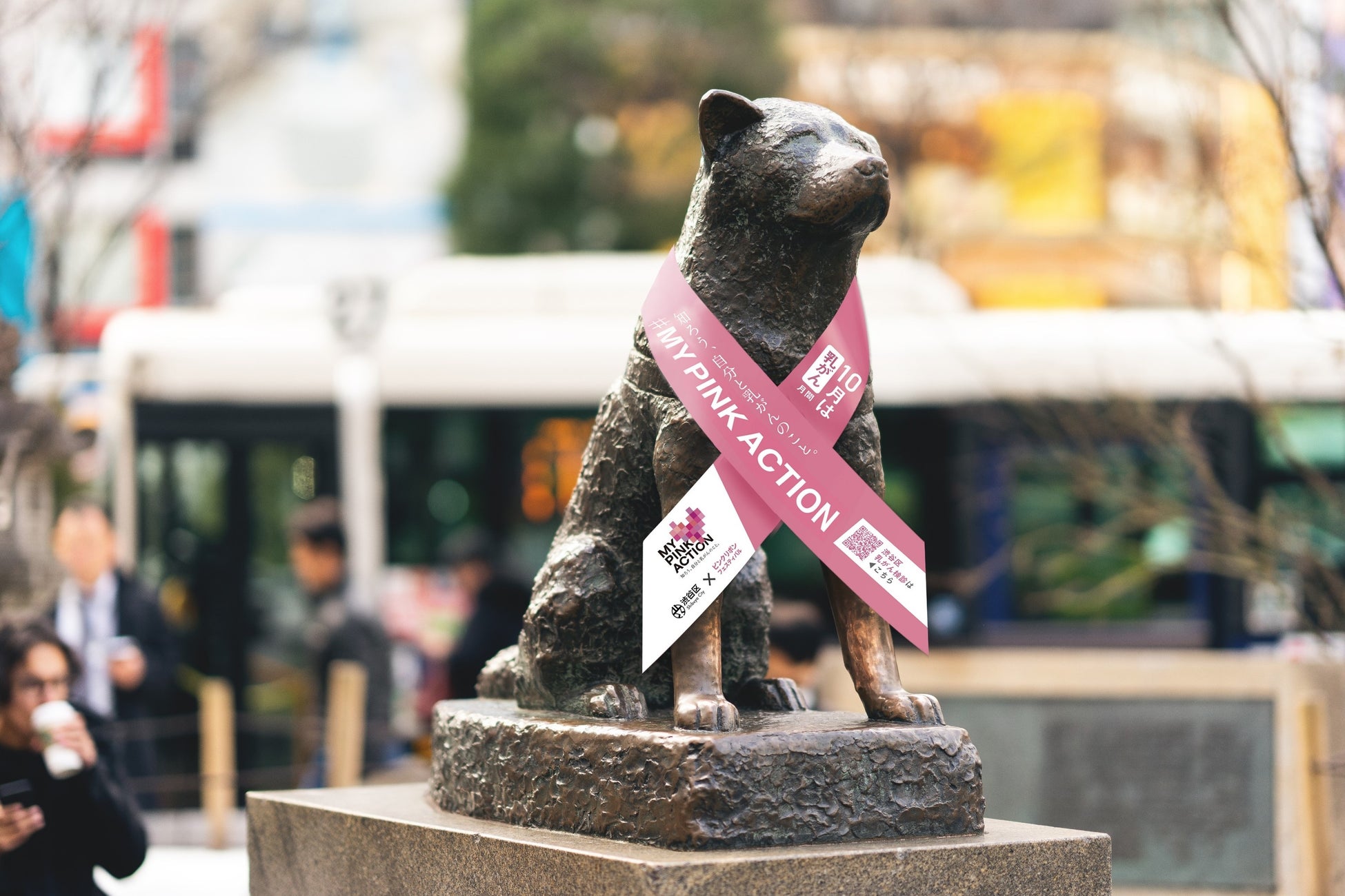 渋谷駅のシンボル忠犬ハチ公像にピンクリボンのメッセージを発信する、オリジナルの「リボン」がかかります。