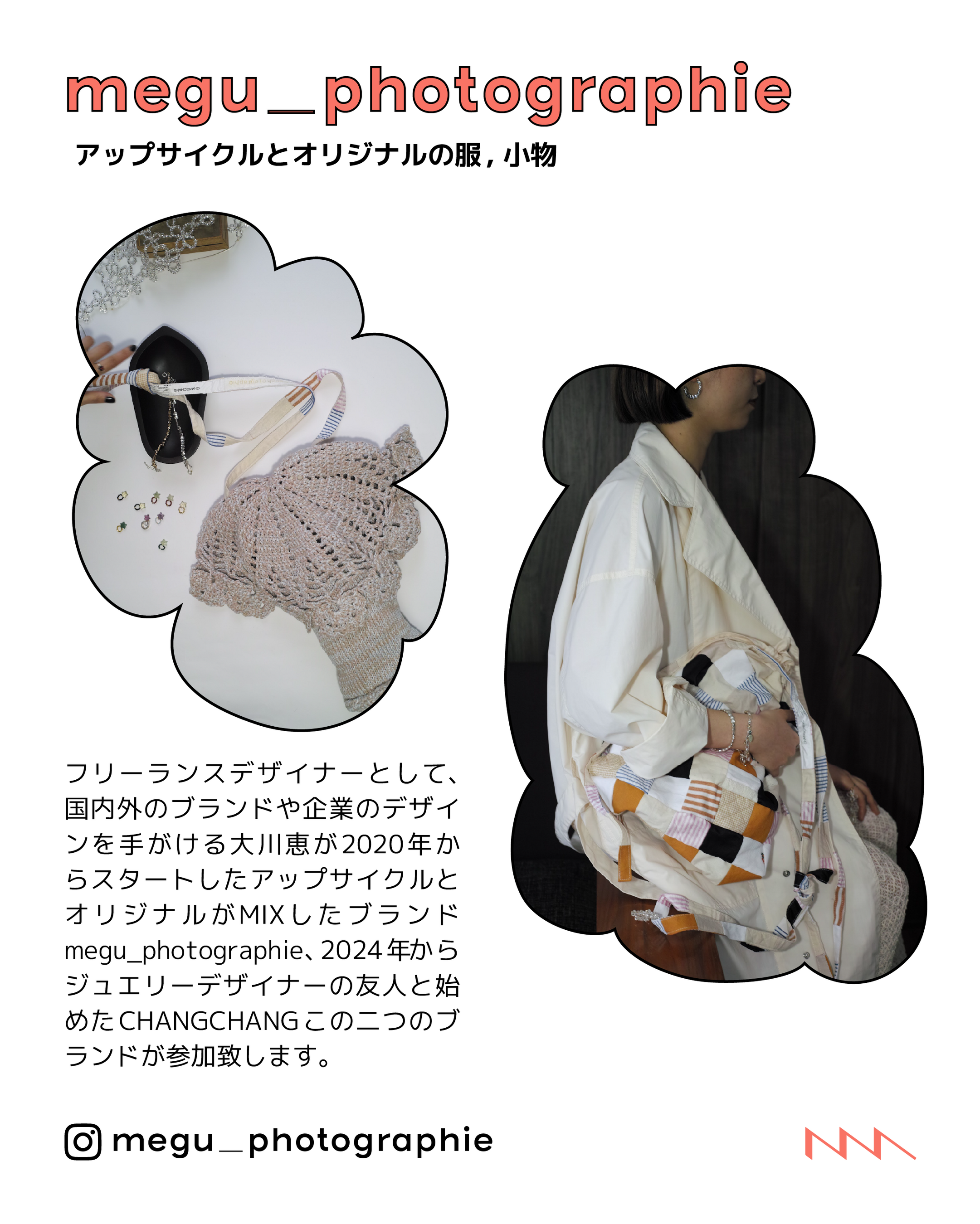 国内外のブランドで活躍するデザイナー大川恵による、アップサイクルとオリジナルをMIXしたブランドと友人のジュエリーデザイナーとではじめたブランドが参加。