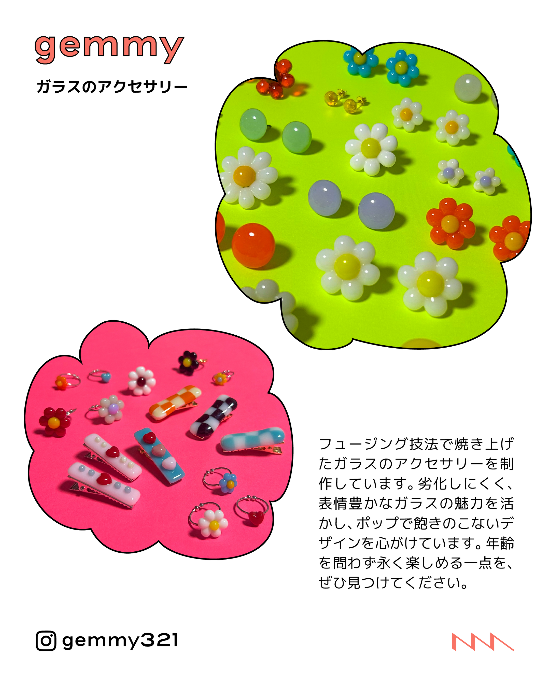 フュージング技法によるガラスアクセサリー。劣化しづらく、永く楽しめるポップで飽きのこないデザイン。