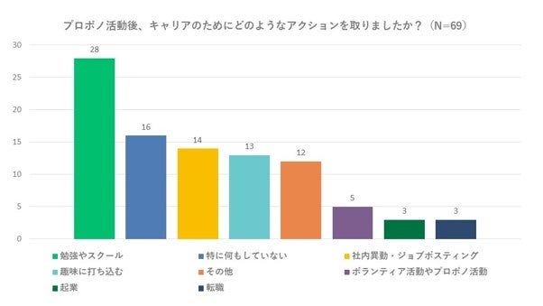 また、プロボノ活動後にキャリアのためにどのようなアクションを取ったかという質問に対しては、「勉強やスクールに通う」と回答した方が41%、「社内異動・ジョブポスティングを行った」方が22%と、半数以上の方が、プロボノ活動後に新たな行動に移されていることが分かりました。