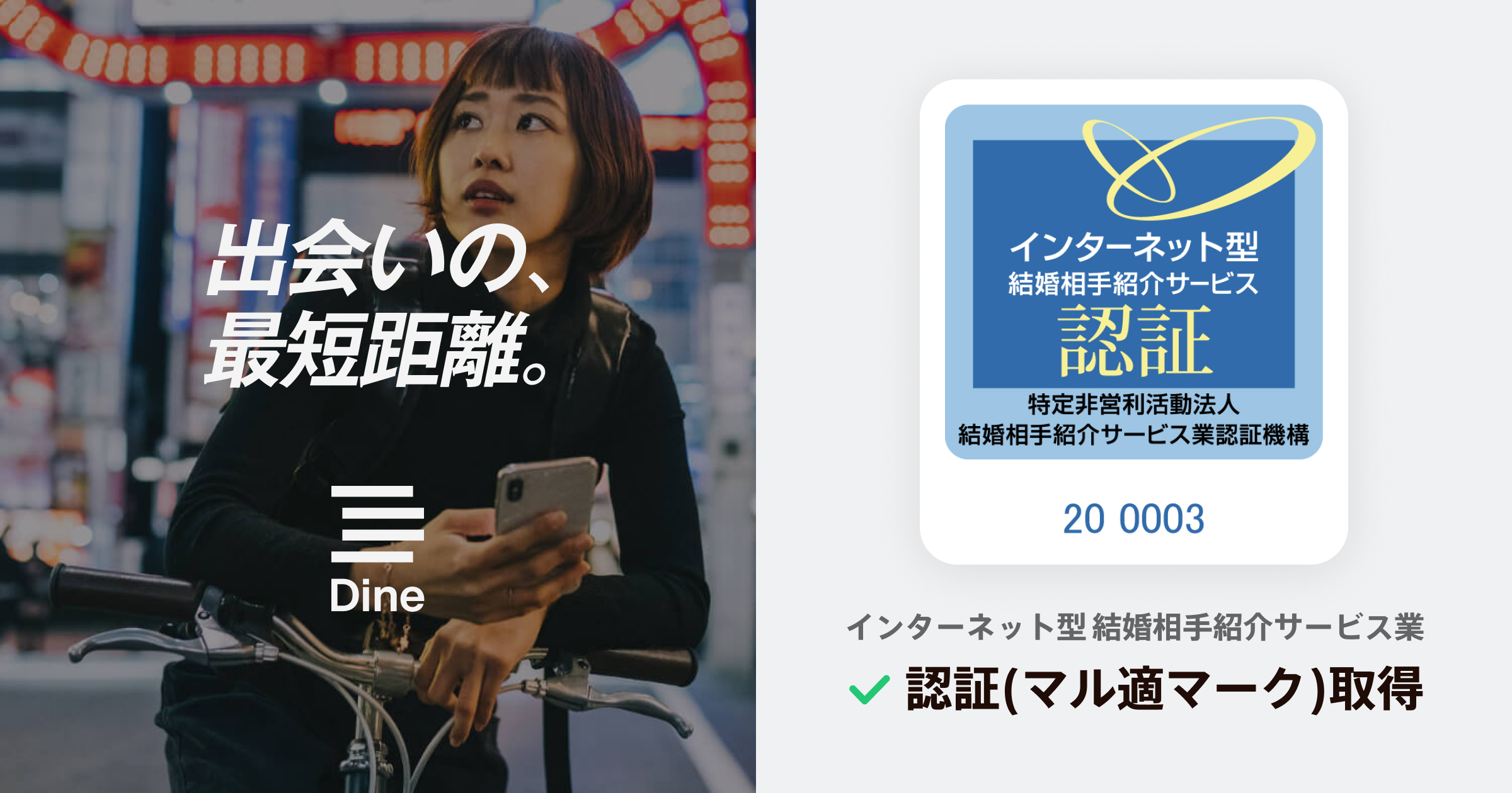 マッチングアプリ「Dine」が、インターネット型結婚相手紹介サービス業の国内初の認証を取得