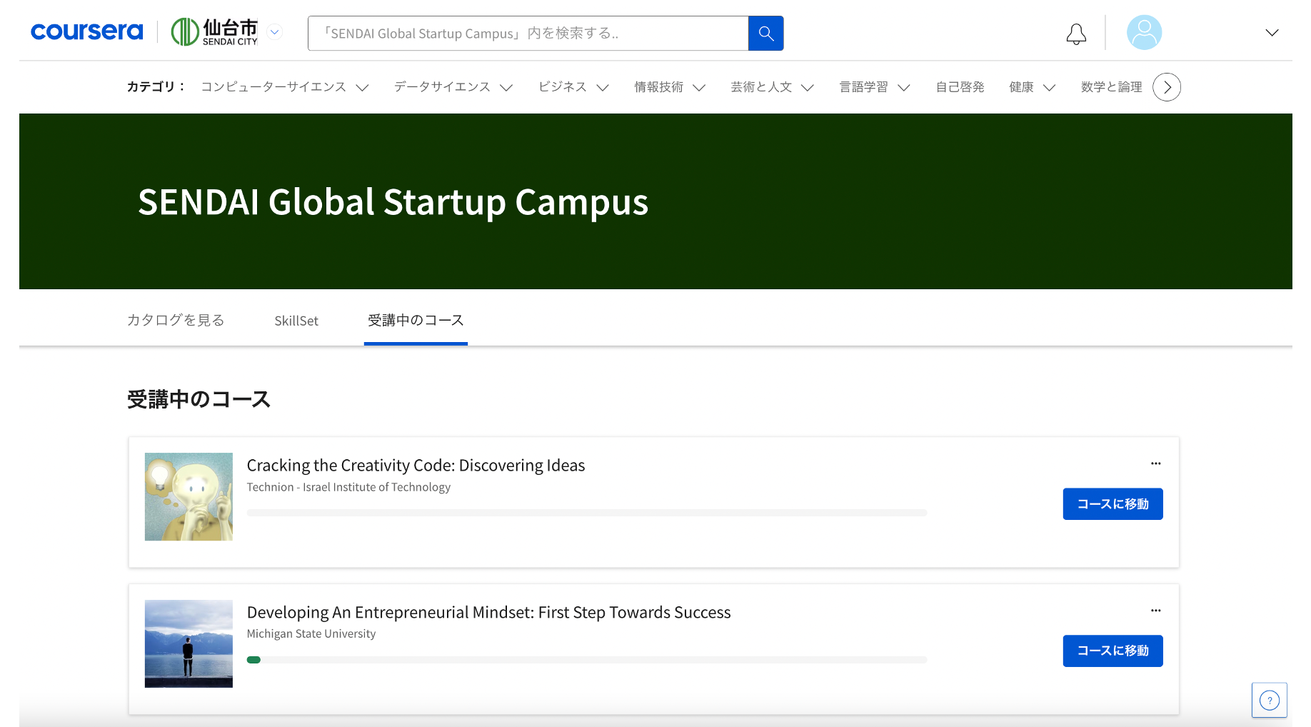 仙台グローバルスタートアップ・キャンパス用にカスタマイズされたCoursera画面