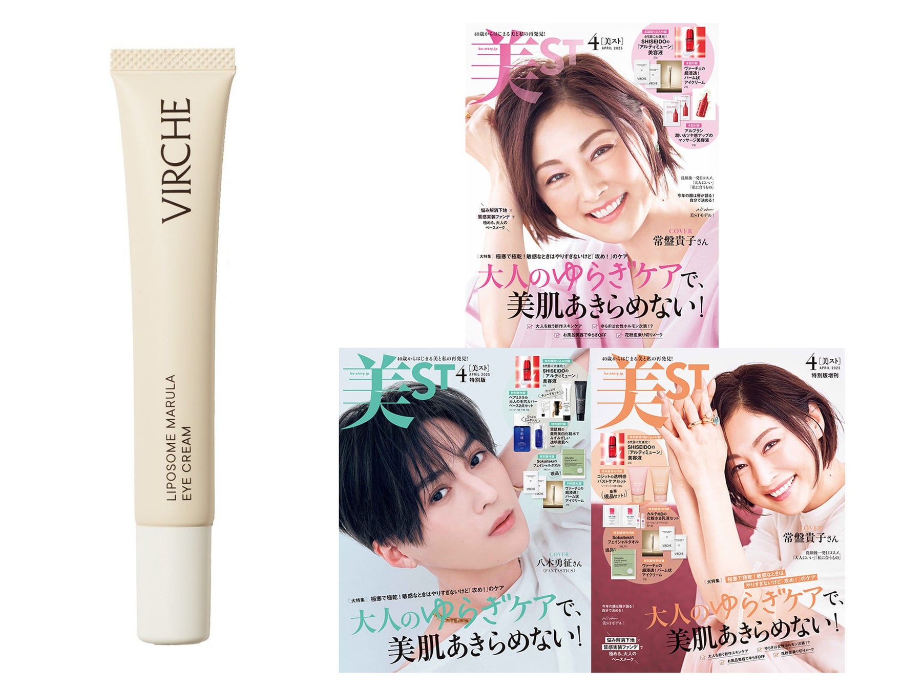 「大人のゆらぎケアで、美肌あきらめない!」を大特集に、本誌・特別版増刊の表紙は常盤貴子さん、特別版の表紙はFANTASTICSの八木勇征さんが飾る『美ST 2025年4月号』。その共通付録として、2025年1月に発売されたばかりのヴァーチェの新商品「リポソームマルラアイクリーム」が登場しています。