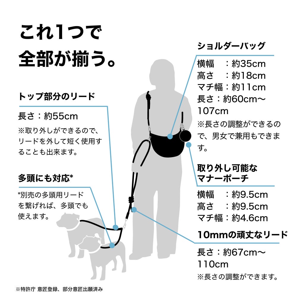「WAGY SHOULDER LEAD BAG」は、リードとバッグが一体化した独自の設計で、これ一つで身軽にお出かけできる革新的なアイテムです。※特許庁 意匠登録/部分意匠出願済み