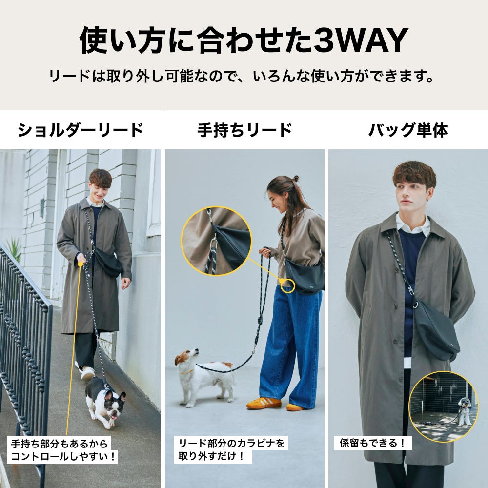 デザイン性・機能性・安全性のすべてを兼ね備えた「WAGY SHOULDER LEAD BAG」。1本で多彩なシーンに対応できる、"次世代型お散歩アイテム"として愛犬家の新たな定番を目指します。