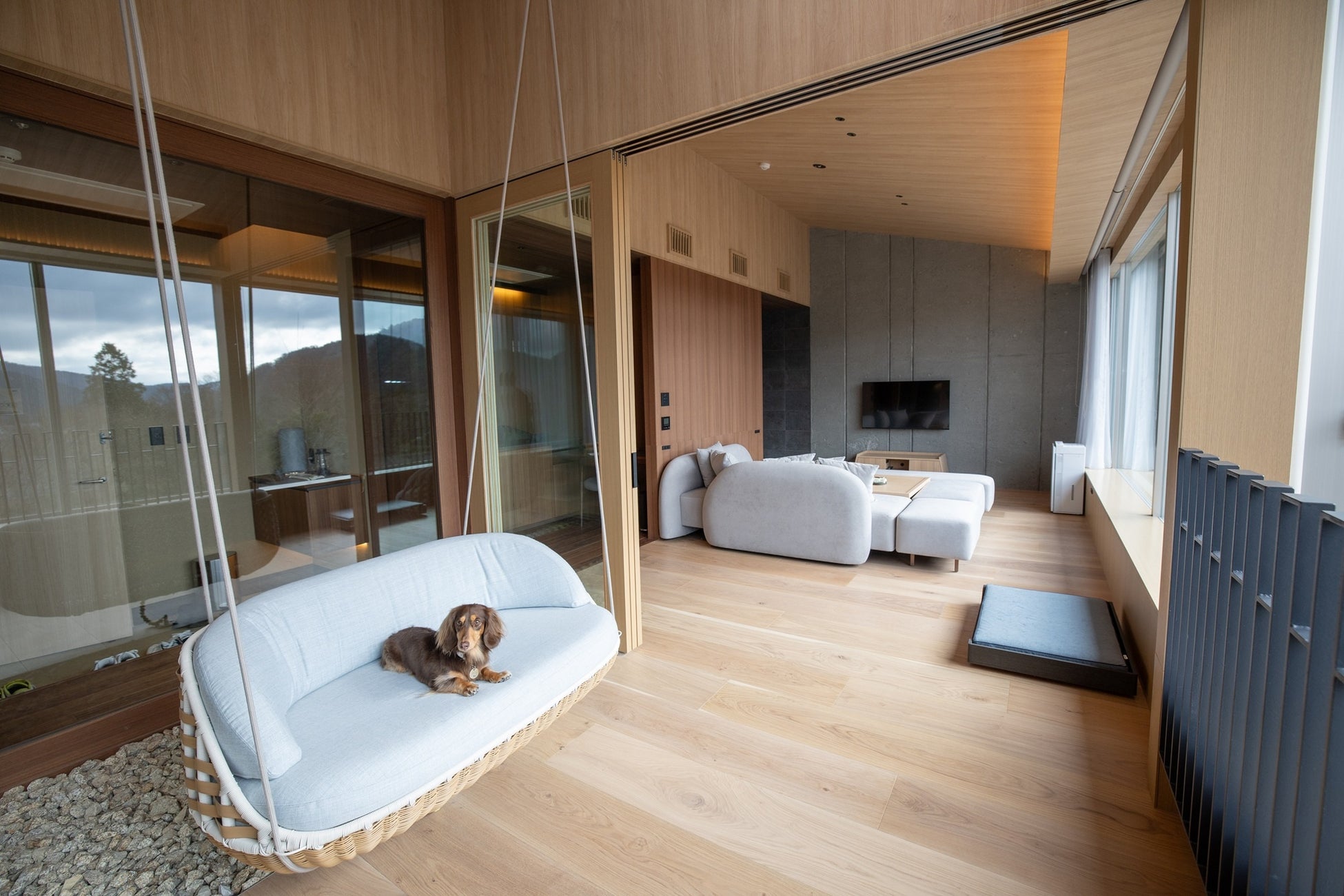 客室は60~200㎡の全10タイプ・15室。全室温泉付きで、滞在中はいつでもプライベートな空間で至福の時間を過ごせます。1階客室にはプライベートドッグラン/ウッドデッキ、2階客室にはインナーバルコニー/サンルームを完備。愛犬とともに自然の空気を全身に浴びながらリラックスできます。