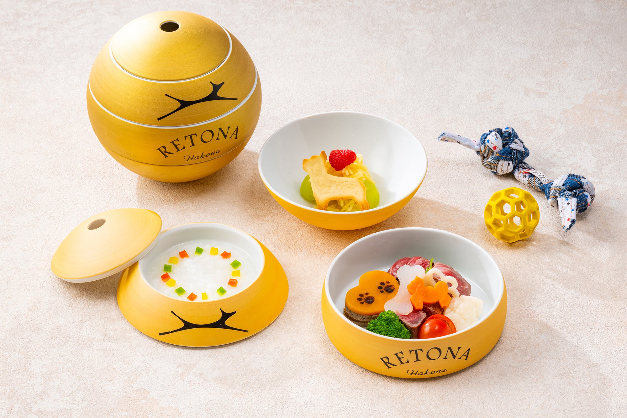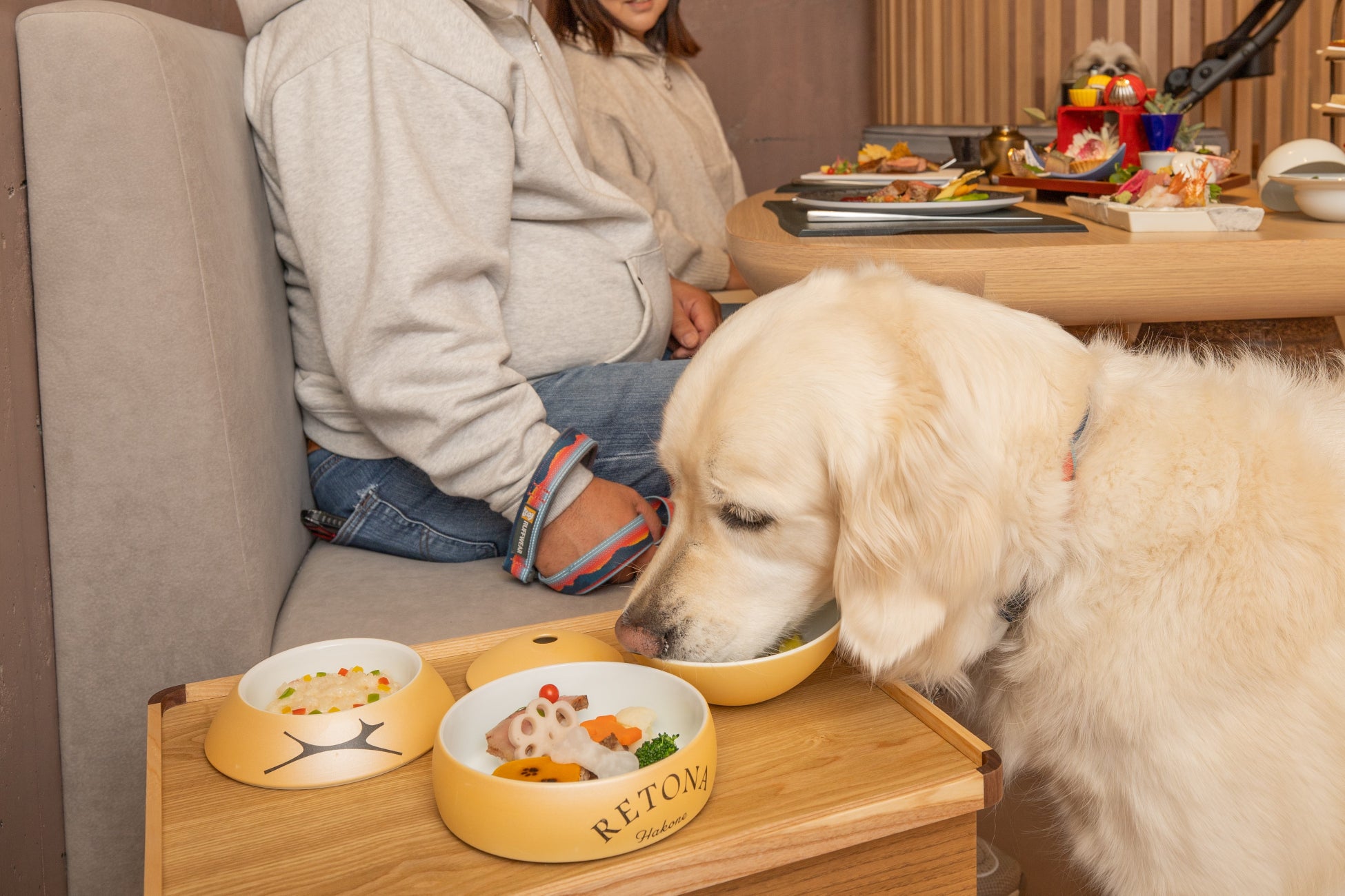 館内1階のダイニングでは、愛犬とともに夕食・朝食をお楽しみいただけます。半個室も配置され、ご家族で気兼ねないプラベートな食事時間を過ごせます。“RETONA HAKONE”では愛犬家のガストロノミーにも着目し、上質な食材とハイクオリティな料理を提供します。ご家族用の夕食は、日本料理を現代的なコース仕立てで風味豊かに表現する「モダン懐石」をご用意。「RETURN TO NATURE(自然への回帰)」をテーマに、地産地消の食材、自家製塩麹など自然由来の発酵食材を取り入れています。愛犬用のお食事は全てペット栄養管理士の資格を持つ料理長監修のオリジナルメニューです。