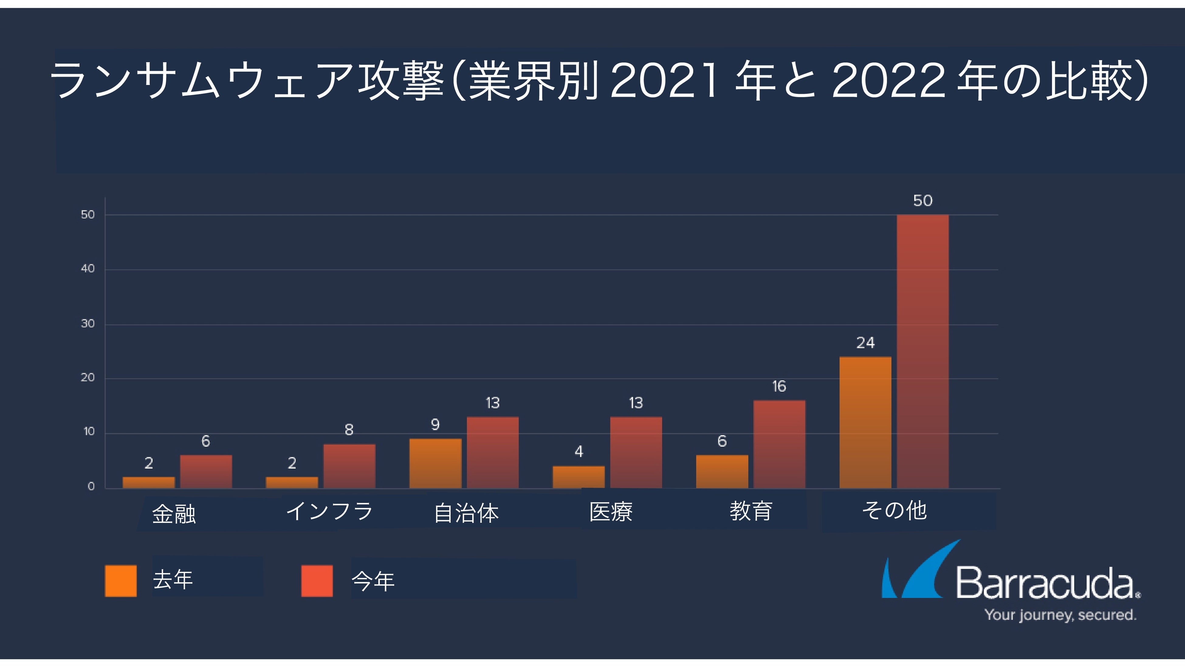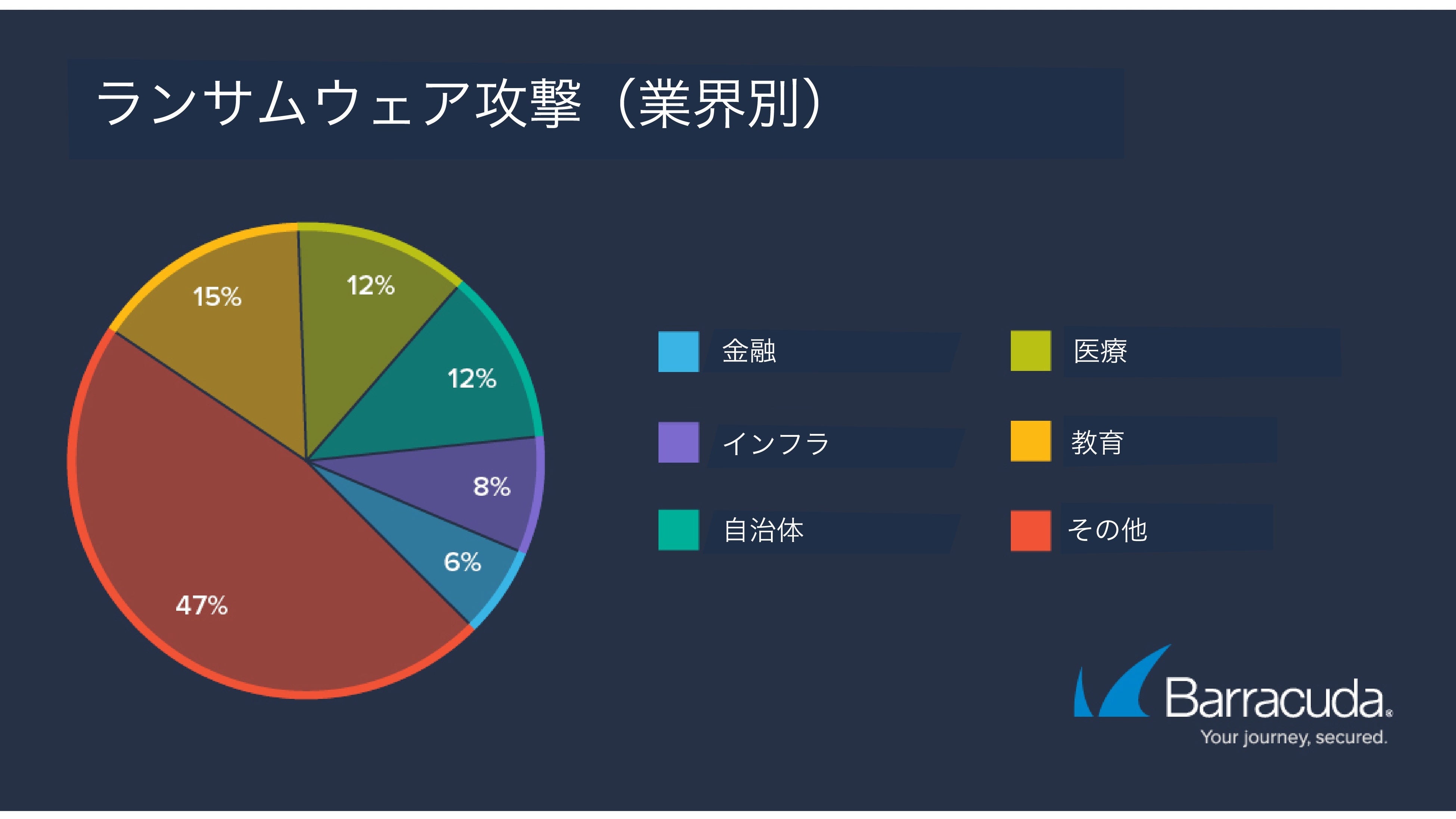 - 自治体への攻撃はわずかに増加しただけですが、過去12ヶ月間のバラクーダの分析では、教育機関へのランサムウェア攻撃が2倍以上、医療および金融業界への攻撃が3倍に増加したことが確認されています。