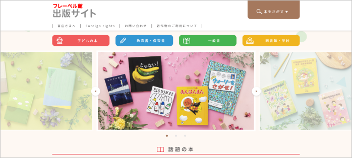 また、出版サイトでは弊社が発刊する児童書や保育図書などの書籍情報を全て掲載し、ネット書店・書籍受注システムとの連携や各SNSとの連携により、見やすく使いやすい購入者目線のサイトを目指しました。