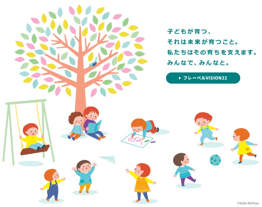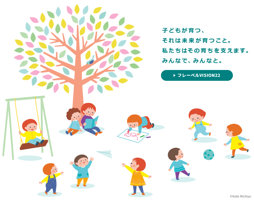 昨年策定した「フレーベルVISION22」のもと、「子どもの未来を、みんなで、みんなと支える」ために、子育て世帯や保育従事者、子ども関連企業に加え、就活生の皆さんにも子どもの育ちを支える企業であることを知っていただけるようなデザインにしました。