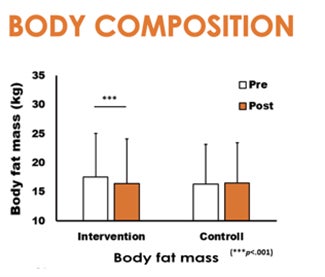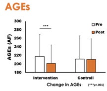 実験群は、AGEsと体脂肪量が有意に減少し対照群の変化は見られませんでした。具体的には、実験群のAGEsのスコアが217から193へと減少し年齢換算をすると-7歳、体脂肪は平均で1kg減少しました*。