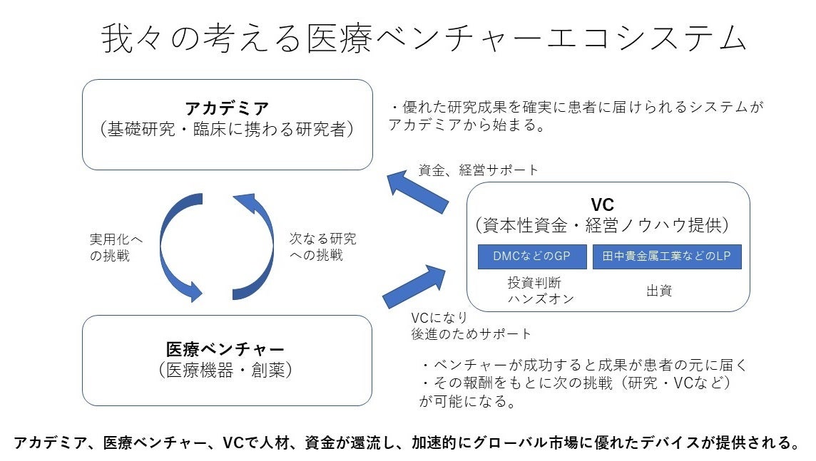 「田中貴金属グループは貴金属のリーディングカンパニーとして、貴金属がもたらす豊かな社会実現と未来の美しい地球への貢献を常に目指しています。今回、『医療に関する日本の優れた基礎技術を早期実用化につなげ、世界に発信する真のエコシステムを構築する』という我々ファンドの理念に深く共感いただき、ともに未来へと歩みを進めていけることをとても嬉しく思います。これまでも田中貴金属グループとは付加価値の高い貴金属の医療機器応用において深い協力関係を築いてきましたが、新たなチャレンジを通して大きなシナジーを発揮していきたいと思います」