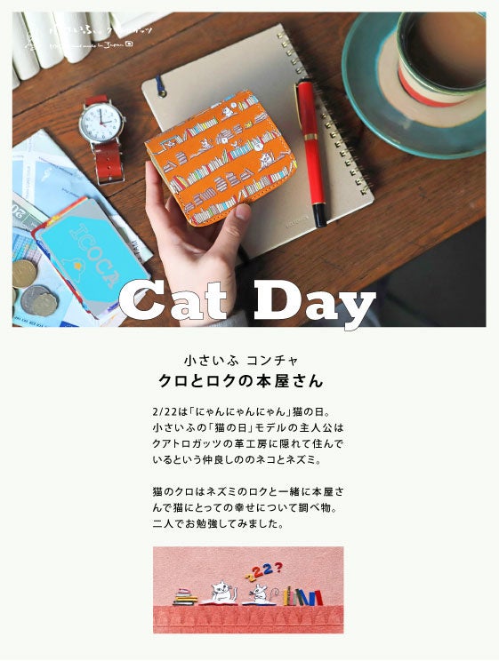 大阪府茨木市で革小物の製作・販売をするクアトロガッツ (代表:中辻大也 ナカツジヒロヤ)は2月1日から公式HPにて猫の日をお祝いする“猫祭り”を開催中。「猫の殺処分について知る」がテーマの小さなお財布が販売中です。「小さいふ。クロとロクと本屋さんクロとロクと本屋さん」の価格は13,800円(税込15,180円)公式HPにて販売中です。https://quatrogats.com/?pid=148803987