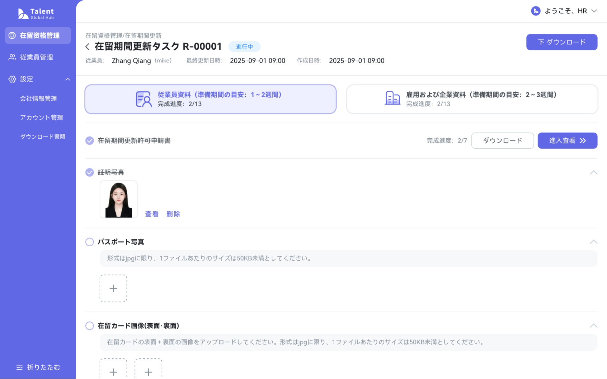 氏名や住所などの基本情報に加え、在留資格の種類、在留期限、満了日などの重要情報をクラウド上でセキュアに一元管理します。パスポートや在留カードなどの必須書類もシステム上にアップロード・保存でき、在留資格更新タスクと紐づけて管理することが可能です。